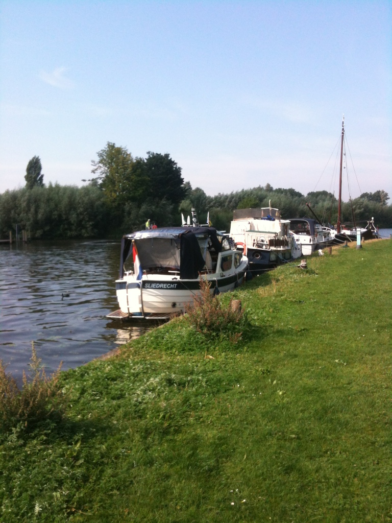 Om half twee was ik voorbij Maarssen, waar ik langs de graskant ben gaan liggen. Een goede plek. Er kwamen hier tientallen sloepen voorbij. Sommigen zaten volgestouwd.