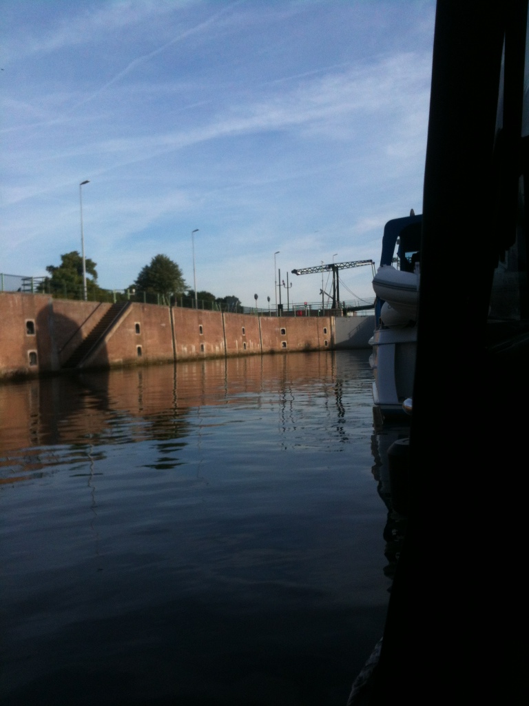 Vanmorgen gingen de eerste boten om acht uur alweer varen richting de sluis. Ik wilde niet eerder weg dan half neegen. Om vijf voor half negen ben ik vertrokken. Bij de sluis lagen de boten. die eerder weg waren gegaan, nog te wachten. Had ik een goede keus gemaakt. De sluis ging vrij snel. Om tien voor negen waren we bij de Koninginnesluis van Vreeswijk. Daar moesten we wachten tot negen uur. Dan begon hij pas. Volgens de almanak moest dat wat eerder zijn. Het wachten in de voorsluis was niet simpel. Regelmatig rolden golven van de Lek de sluis in. Met alleen een middenlijntje aan de middenbolder was dit hard werken.